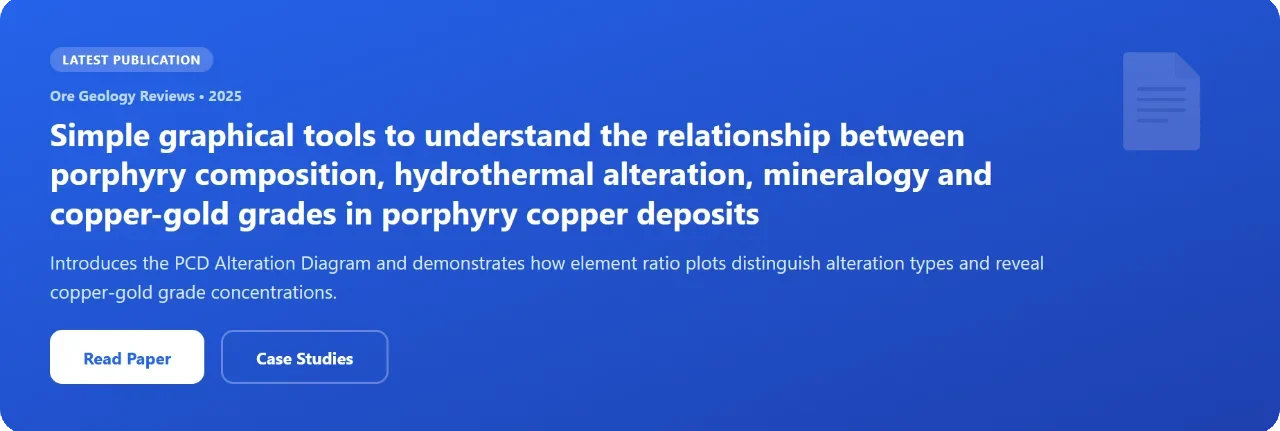 Several models of hydrothermal alteration around porphyry copper deposits have been developed over the past 50 years. The initial models, based on the south-west USA porphyries (Lowell and Gilbert, 1970; Fig 1A), showed concentric zoning around the central productive porphyry of potassic alteration (K-feldspar, biotite) in the core followed by phyllic (sericite-pyrite) alteration merging outwards to propylitic (chlorite, epidote, albite) alteration at the periphery (Fig. 1A). The model showed a Cu shell overlapping the boundary between the potassic core and phyllic envelope.